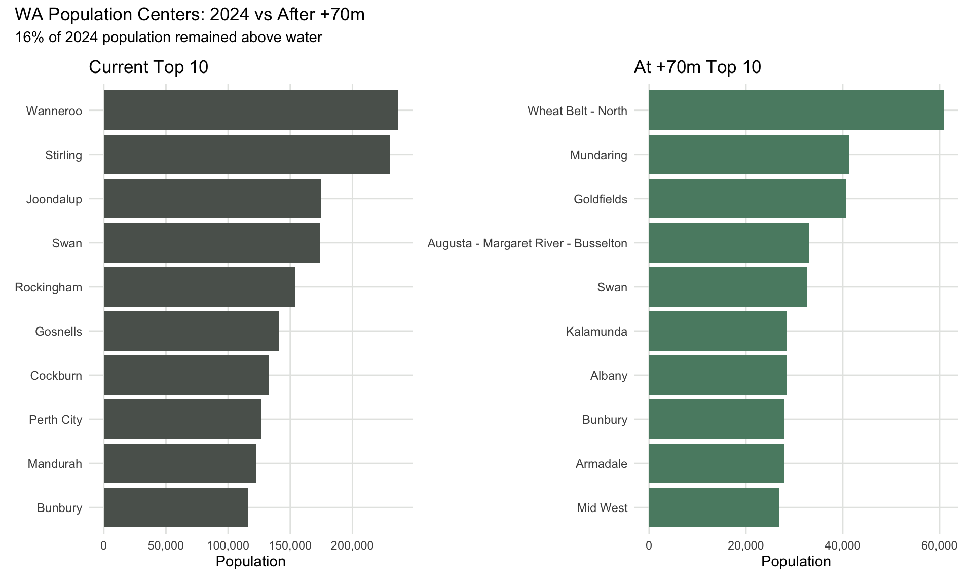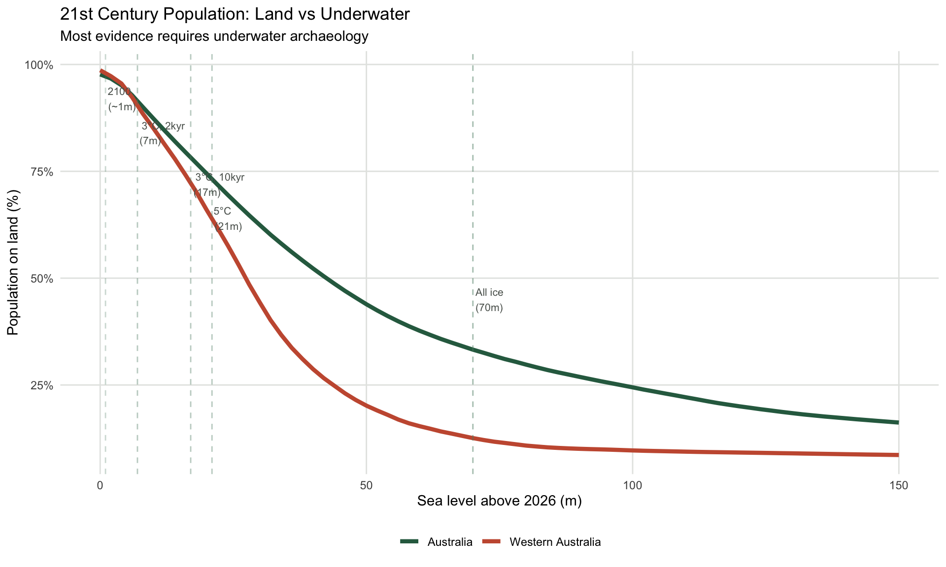 How much of the 21st century archaeology is available to land-based archaeologists without requiring underwater work? After 70m of sea level rise, the homes of around 32% of Australia’s population are accessible without diving. Despite Western Australia’s economy stretching far inland with agriculture and mining, only 16% of the population remains above water; the state was more affected than the more diverse eastern states, and different sorts of sites may be underwater.